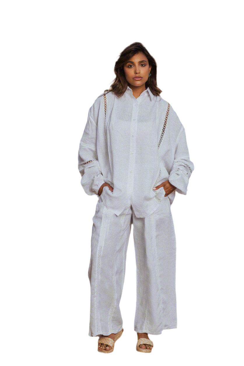 Elevate your wardrobe with the Daffodil white linen outfit, a stunning combination of a pure linen shirt and pants designed exclusively for you. Perfect for any occasion, the Daffodil women's linen set promises both comfort and style, making it a must-have addition to your collection.