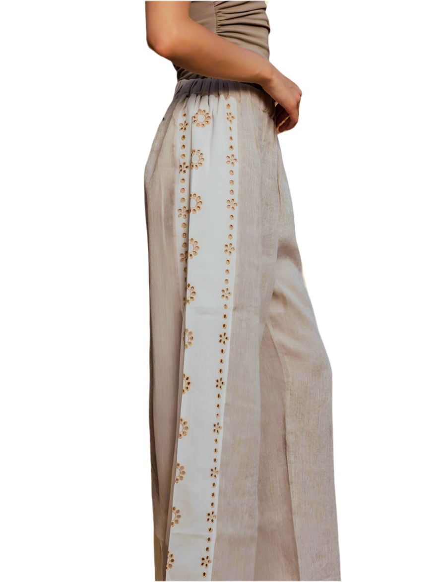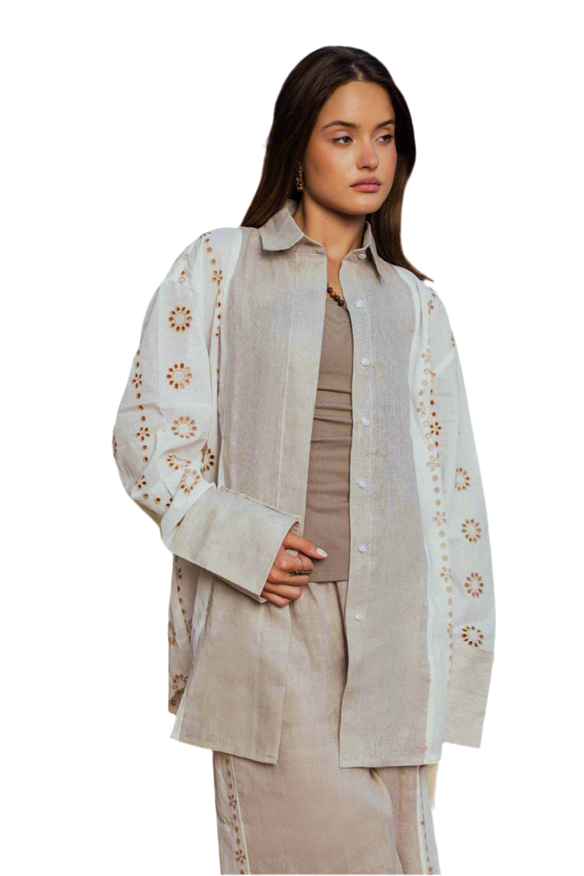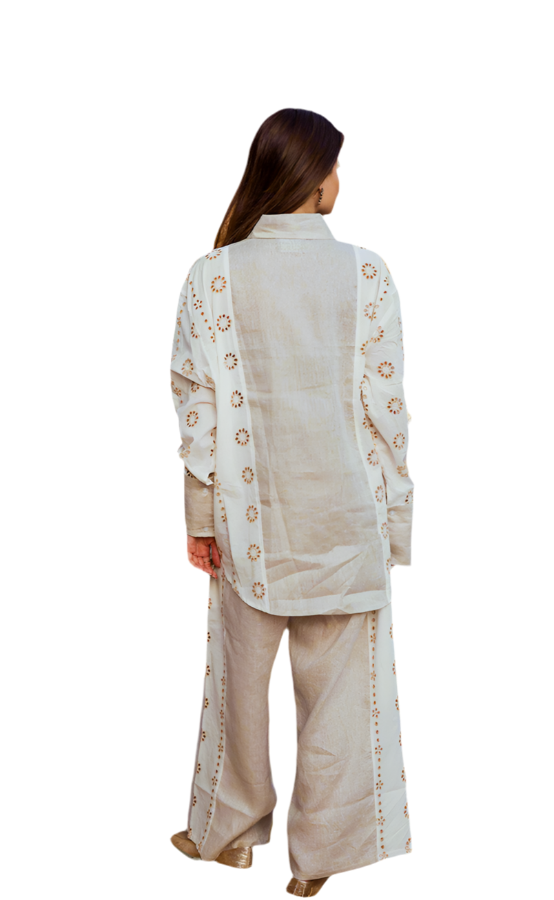 Elevate your style with the Queen Anne lace outfit set. This exquisite combination of a pure linen shirt and pants, adorned with delicate Rukama. The harmonious blend of beige and white hues complements any wardrobe, making it a versatile choice for any occasion.