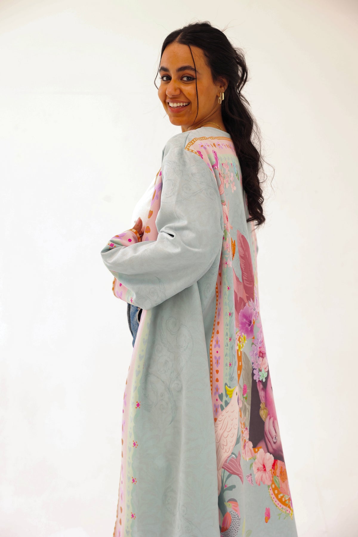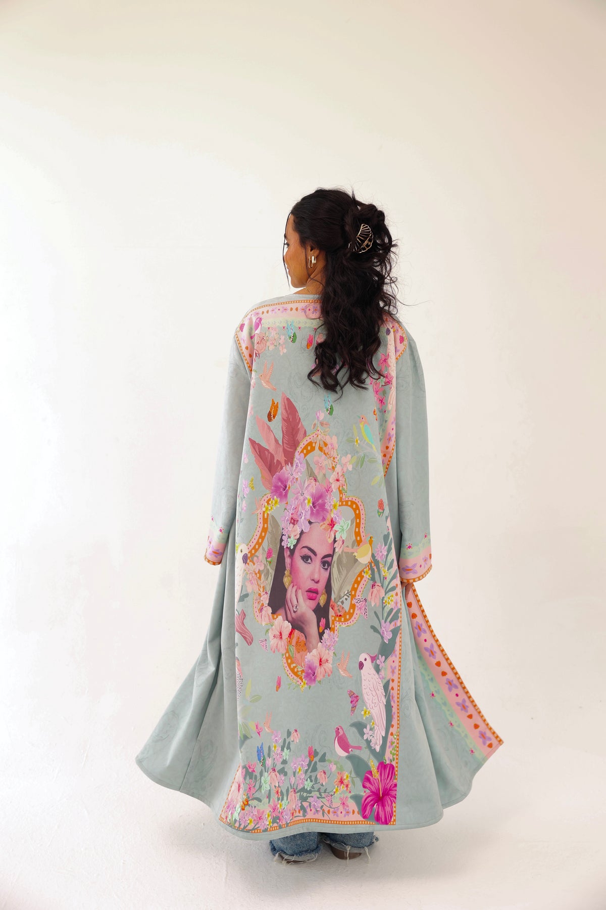 The La Festiva Suede Kaftan is a statement piece that blends artistic expression with effortless elegance. Designed with a flowing open silhouette, it features unique prints inspired by heritage, femininity, and modern bohemian spirit.